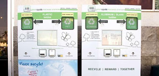 Here at Paperlicious, we love recycling. That's why we used only 100% recycled fiber paper from a mill that supports sustainable forestry for all of our custom invitations and green stationery.SO.... when Ms. Paperlicious was recently at a Rite Aid and noticed this fancy little kiosk outside the store, she went home and immediately googled said kiosk. Joy to behold! It was a can recycling center from greenopolis.com!